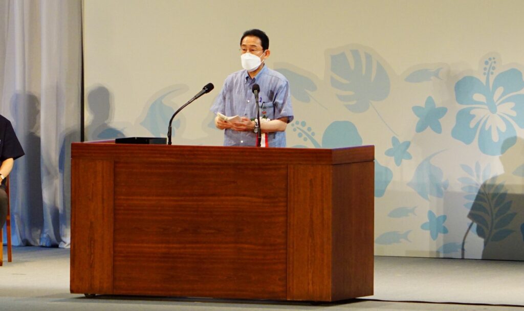 岸田氏は、式典の休憩時間に県の振興指針となる「第6次沖縄振興計画(新・沖縄21世紀ビジョン基本計画)」を玉城デニー県知事から受け取り、政府と県が協働して「平和で豊かな島」の実現に取り組むと述べた。発展計画は沖縄振興策を日本経済発展への貢献と結びつけている。沖縄がアジア地域の玄関口として臨空・ 臨港都市と新たな拠点を形成することや、駐留軍用地跡地の有効利用などを挙げた。