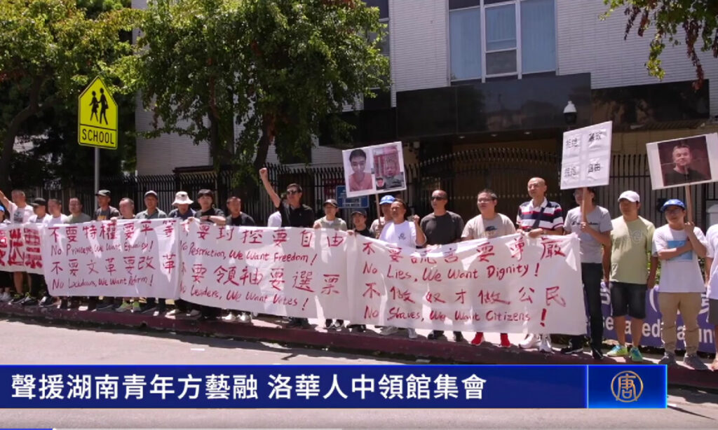 3日(現地時間)、米ロサンゼルスの中国領事館前で、方芸融(ほう げいゆう)さんを声援し、中国共産党に抗議する華人団体による集会が行われた。