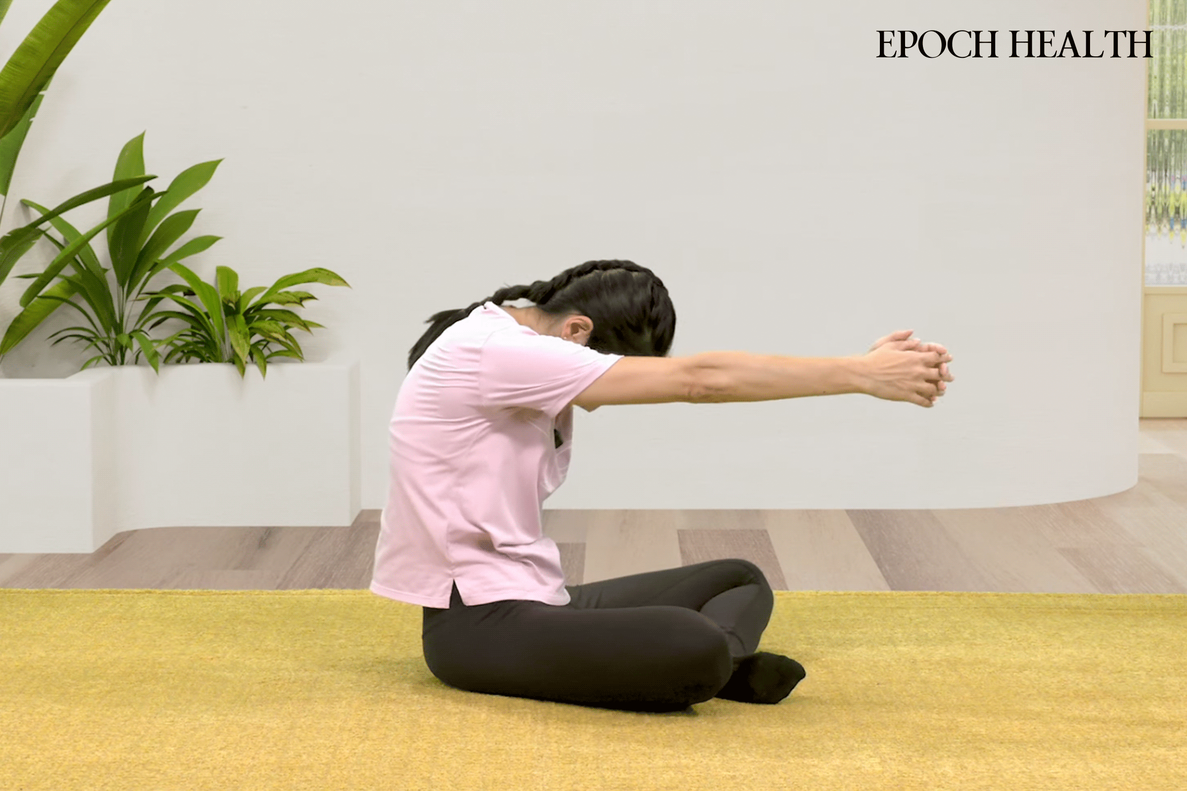 背筋を伸ばして座り、両腕を前方に伸ばします。このとき背中を丸めて上背部の筋肉を伸ばします。