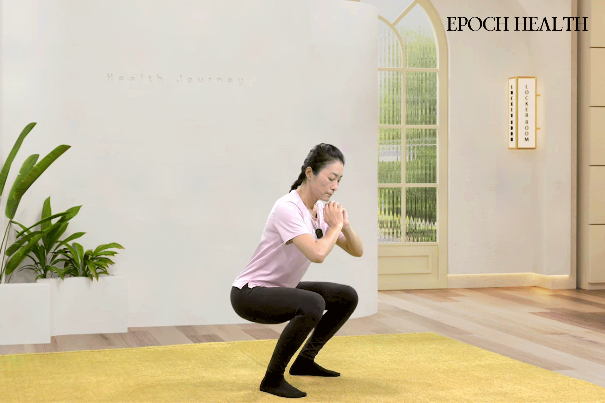 息を吸いながら、腰を後ろに引いて太ももが床と平行になるまでゆっくり下げます。この姿勢を3~5秒キープします。