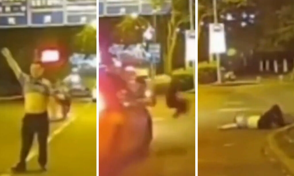 映像には酔っぱらった様子の男性が、道路脇でタクシーを呼ぶ様子、そこへ獣のように飛び出す2台のタクシー。次の瞬間、1台が男性の懐へ飛び込んだ。幸い男は間一髪で反応し、タクシーのボンネットに手をついて後ろへと自ら跳ねた。なんとか車と体の直接の接触を避けたものの、彼の体は宙を舞ってとんぼ返りをし、その後、路上を転がった。