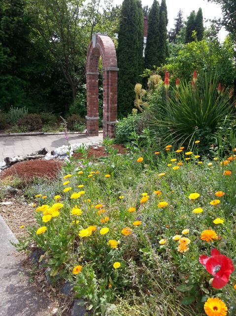 出入り口は洒落たアーチ型レンガ造りの門になっていて、訪れるたびに新しい発見があります。草も木もやや伸び放題でワイルドですが、周辺住民の憩いの場です。