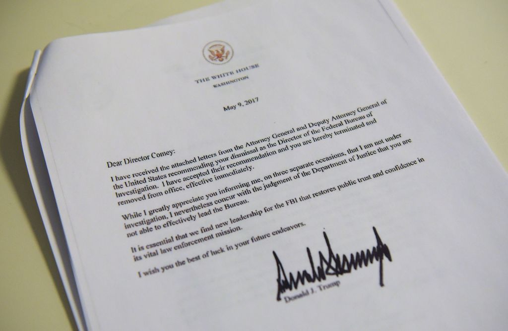 ホワイトハウスが公表した書簡では、トランプ大統領は冒頭で、コミ―長官のこれまでの仕事をねぎらう言葉をつづったのち、「あなたが効果的に捜査を導くことができないとの司法省の判断に同意する」と伝えた。
