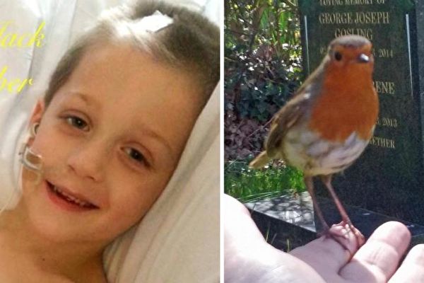 ジャックくんのことを思いめぐらしていると、墓石にロビン(コマドリ)という小さい鳥が現れました。鳥はマリーさんの周りを飛び回り、彼女の肩に止まったり、双子の弟の靴先に留まったりしました。とっさにマリーさんが携帯でその様子を録画していると、小鳥は飛んできてマリーさんの指に留まったのです。