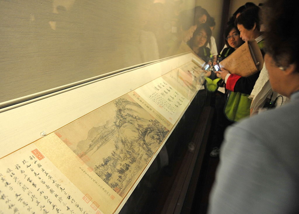 『黄山憶遊図』は張大千氏(1899年-1983年)が1956年に描いた山水画で、近代の浅絳山水の模範作とされています。この作品は、構図にゆるみがなく、筆遣いに勢いがあり、松の木が画面を横切る大胆な構図は唯一無二とされます。張大千は「皴擦り」の技法を用いて、薄墨で輪郭を描いてから代赭色を着色しました。極めて放逸な表現をみせる松の木は早期の張大千が模倣していたころの筆遣いですが、背後にある山石は、俊敏でありながら雄健な筆遣いであり、1950年代における張大千の画風の転換が伺えます。その画風は、石濤(セキ・トウ)などの画家の画風に縛られず、ますます円熟していきました。同作品は墨筆の情緒もありながら、素朴な気韻も備えており、まさに世にも稀な逸品です。