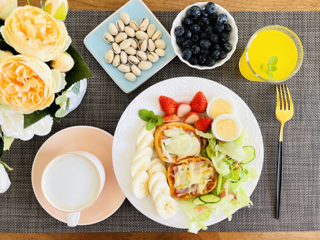 コーヒーを添えて、ブルーベリーやピスタチオと一緒に、バランス良い朝ごはんを食べましょう。(笑)