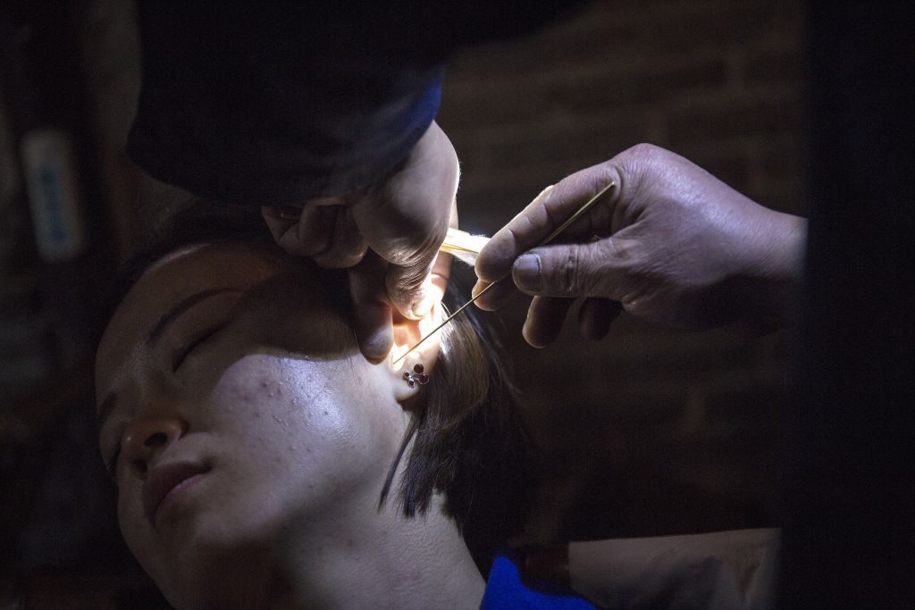 両手の親指と人差し指で耳介の中央部をつかんで左右両側へゆっくり引っ張る。引っ張る力を徐々に強くし、痛みを感じない程度で止める。毎回3~5分間続ける。この方法は頭痛、頭がぼうっとする、神経衰弱、耳鳴りなどの症状に効く補助的な治療法です。