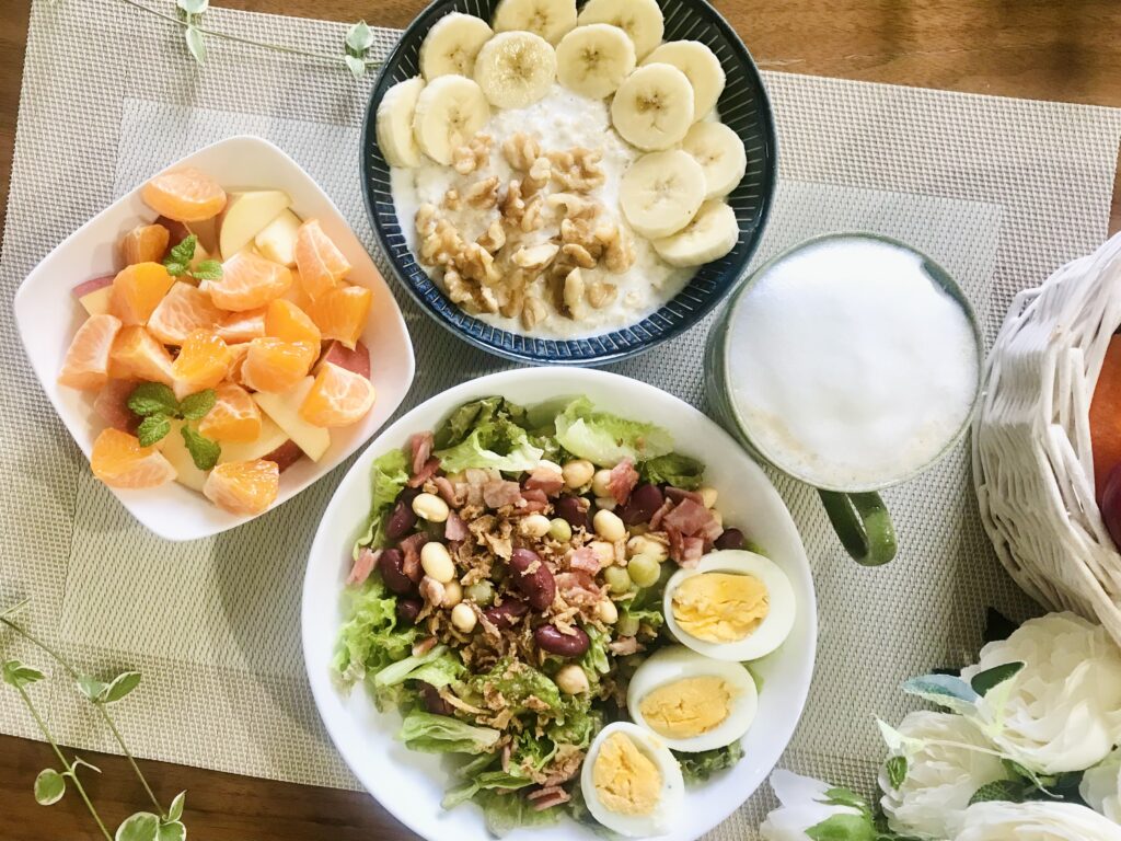 #breakfast #oatsmeal #banana #salad #murcott #coffee #朝ごはん #オートミール #マーコット #バナナ #サラダ #コーヒー