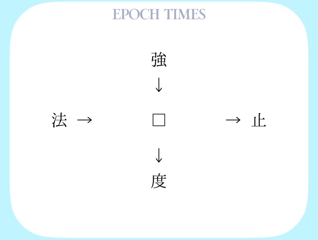 □に入る漢字を考えてください。 適当な漢字を入れることによって、「"強□、□止、法□、□度"」という4つの二字熟語ができます。 □に入る漢字は、熟語によって読み方が違ってもかまいません。