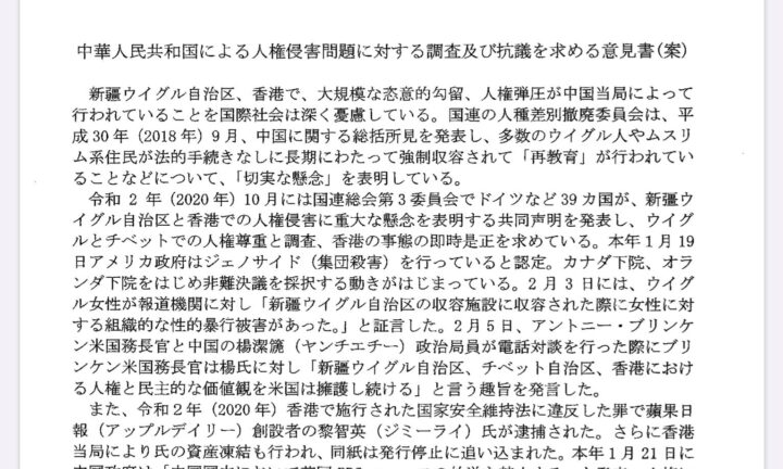 「中華人民共和国による人権侵害問題に対する調査及び抗議を求める意見書」全会一致で可決致!皆様ありがとうございます!