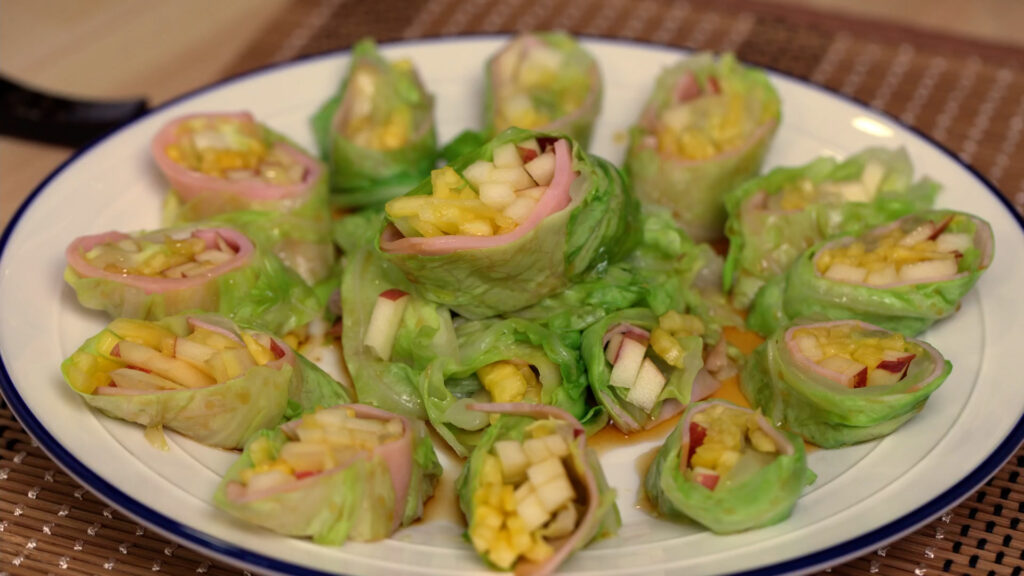3、しんなりしたキャベツの葉を広げ、縦半分に切る。ハム、りんご、パイナップルを適量のせ、手前から巻いてバットに並べる。