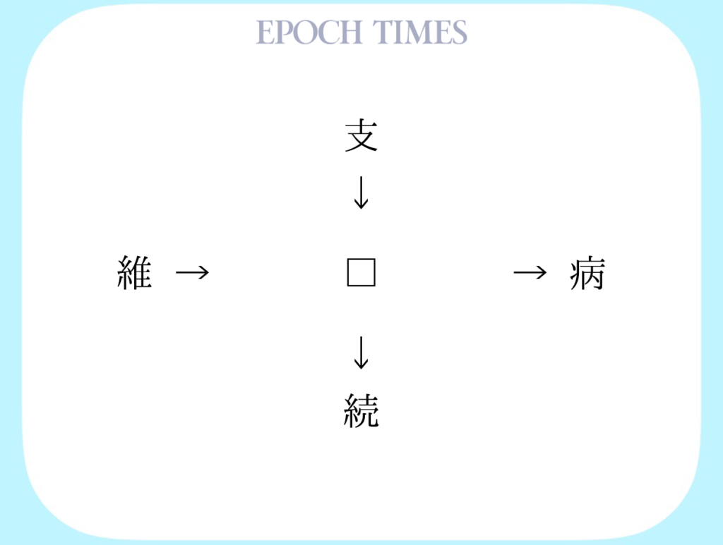 □に入る漢字を考えてください。 適当な漢字を入れることによって、「"支□、□病、維□、□続"」という4つの二字熟語ができます。 □に入る漢字は、熟語によって読み方が違ってもかまいません。