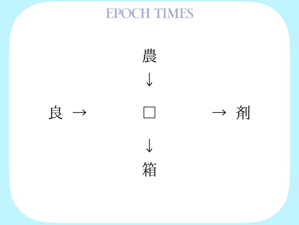□に入る漢字を考えてください。 適当な漢字を入れることによって、「"農□、□剤、良□、□箱"」という4つの二字熟語ができます。 □に入る漢字は、熟語によって読み方が違ってもかまいません。