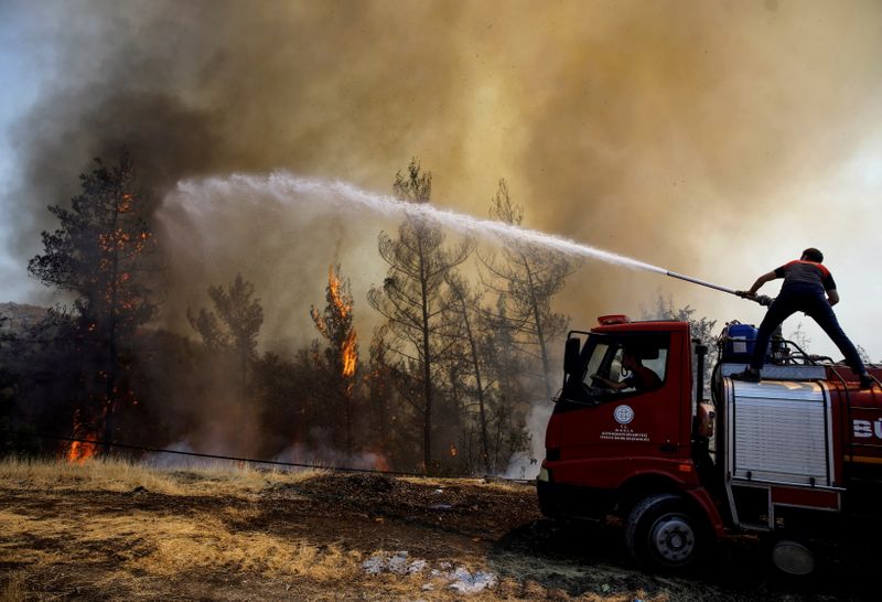 [ミラス(トルコ) 4日 ロイター] – トルコのエルドアン大統領は4日、南部沿岸地域で1週間以上続いている山火事について、同国史上最悪の規模だと述べた。4日には南西部にある発電所にも火が燃え移った。