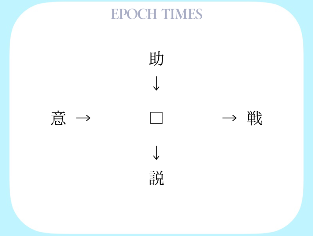 □に入る漢字を考えてください。 適当な漢字を入れることによって、「"助□、□戦、意□、□説"」という4つの二字熟語ができます。 □に入る漢字は、熟語によって読み方が違ってもかまいません。