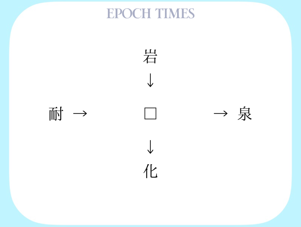 □に入る漢字を考えてください。 適当な漢字を入れることによって、「"岩□、□泉、耐□、□化"」という4つの二字熟語ができます。 □に入る漢字は、熟語によって読み方が違ってもかまいません。