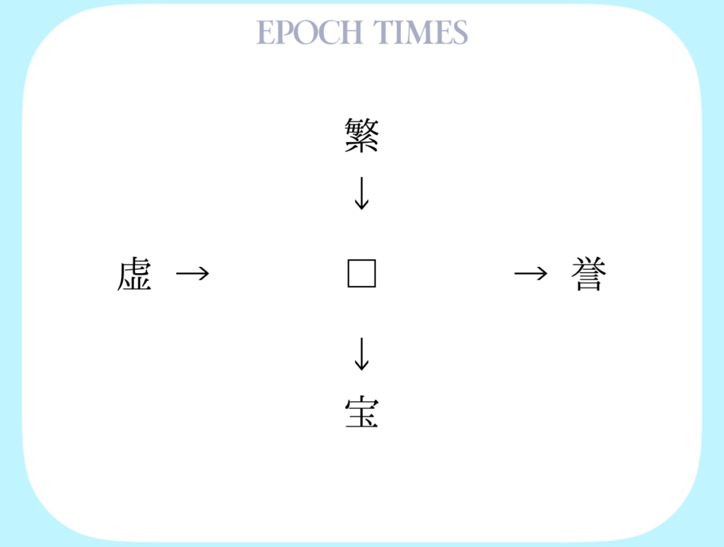 □に入る漢字を考えてください。 適当な漢字を入れることによって、「"繁□、□誉、虚□、□宝"」という4つの二字熟語ができます。 □に入る漢字は、熟語によって読み方が違ってもかまいません。