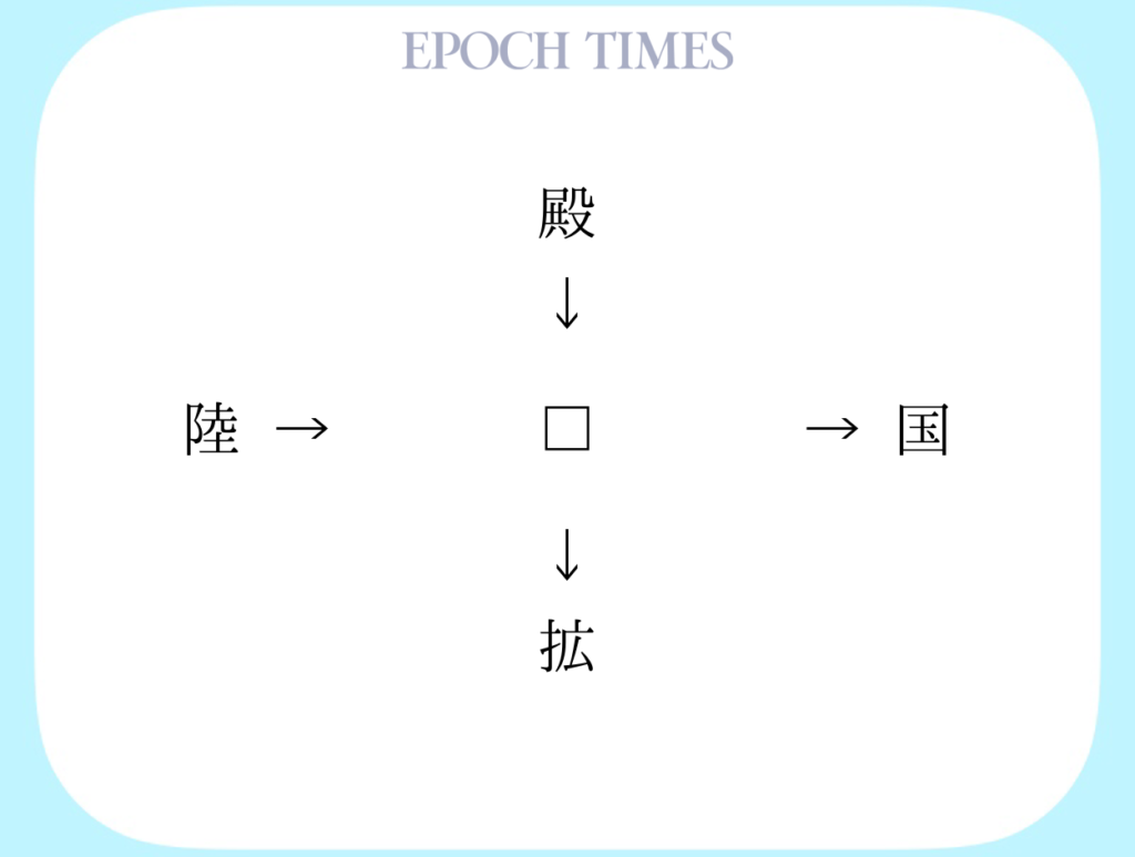 適当な漢字を入れることによって、「"殿□、□国、陸□、□拡"」という4つの二字熟語ができます。