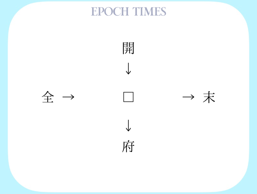 □に入る漢字を考えてください。 適当な漢字を入れることによって、「"開□、□末、全□、□府"」という4つの二字熟語ができます。 □に入る漢字は、熟語によって読み方が違ってもかまいません。