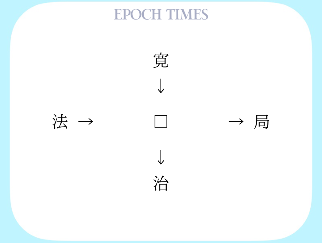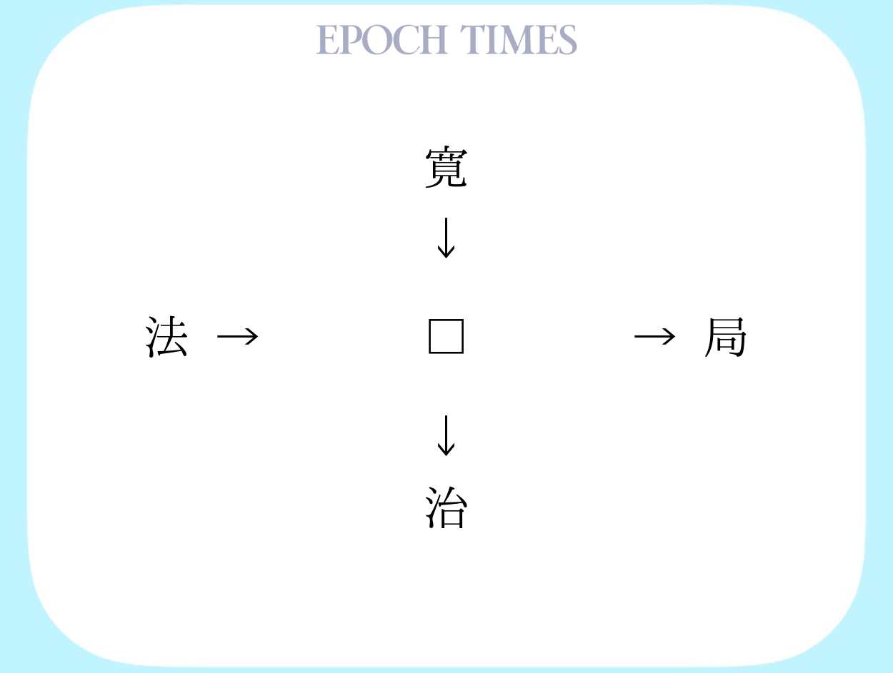 □に入る漢字を考えてください。 適当な漢字を入れることによって、「"寛□、□局、法□、□治"」という4つの二字熟語ができます。 □に入る漢字は、熟語によって読み方が違ってもかまいません。