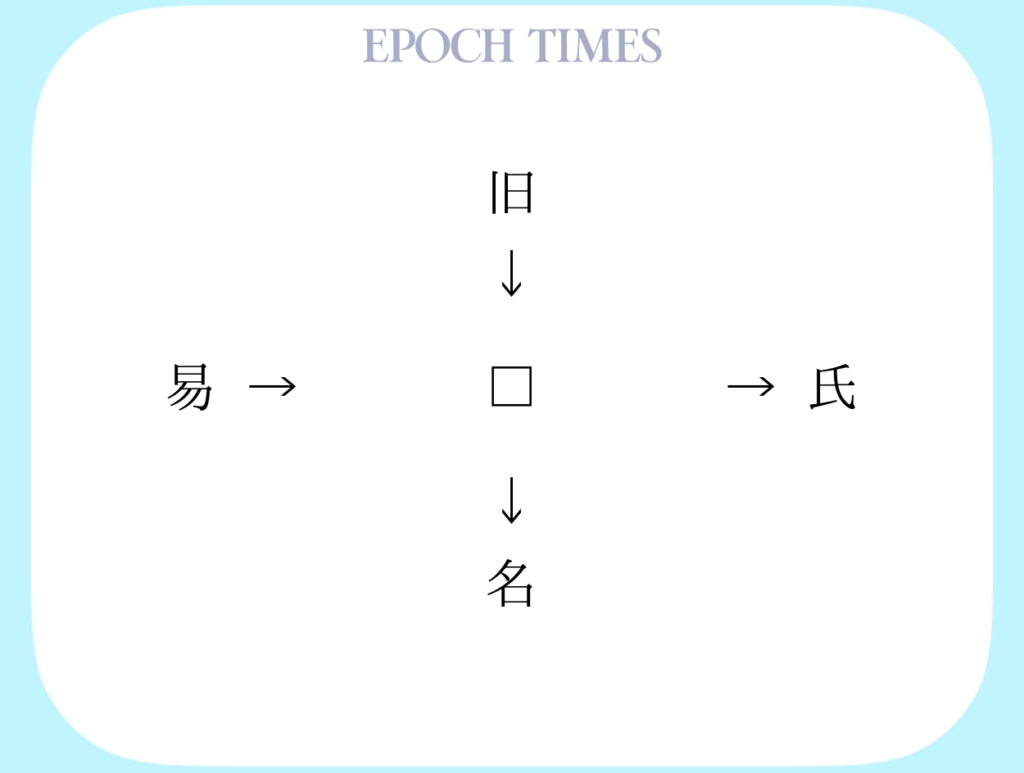 □に入る漢字を考えてください。 適当な漢字を入れることによって、「"旧□、□氏、易□、□名"」という4つの二字熟語ができます。 □に入る漢字は、熟語によって読み方が違ってもかまいません。