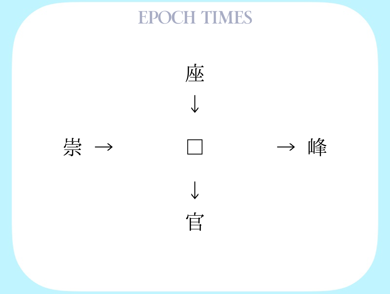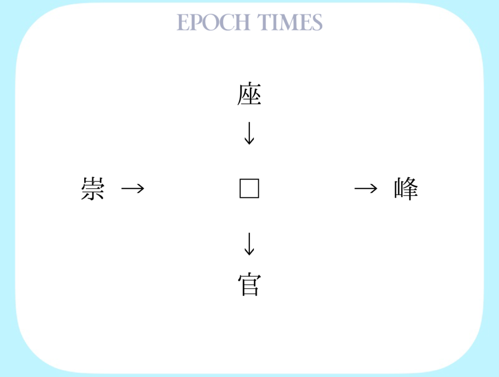 □に入る漢字を考えてください。 適当な漢字を入れることによって、「"座□、□峰、崇□、□官"」という4つの二字熟語ができます。 □に入る漢字は、熟語によって読み方が違ってもかまいません。
