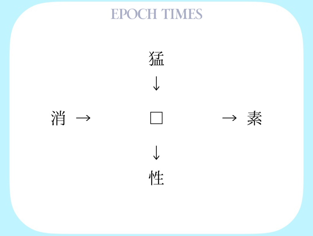 適当な漢字を入れることによって、「"猛□、□素、消□、□性"」という4つの二字熟語ができます。