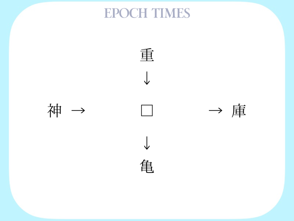 適当な漢字を入れることによって、「”重□、□庫、神□、□亀”」という4つの二字熟語ができます。