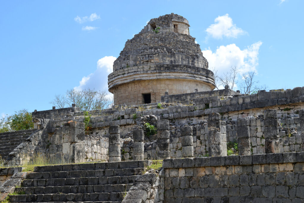 チチェン・イッツァの天文台の中心部には螺旋階段が設けられており、上部には天体観測のための天窓があります。この窓は重要な照準線になっており、西側は春分と秋分の日没と、月が最北端に沈むときの方向を確認することができます。そして、南側の対角線はちょうど地球の南極と北極を指しています。