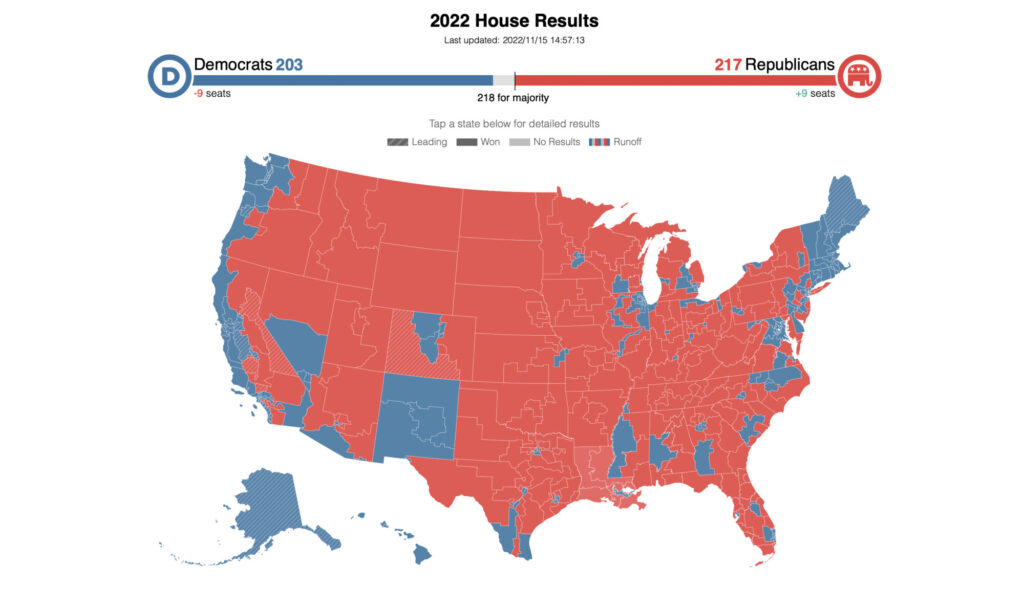 開票が続く米中間選挙では14日、下院で共和党が217議席を獲得し、過半数の218議席まであと1議席に迫った。ニューヨーク州では共和党のブランドン・ウィリアムズ氏が獲得し、カリフォルニア州では現職のケン・カルバート氏とミシェル・スティール氏の両共和党候補がそれぞれ再選を確実にした。