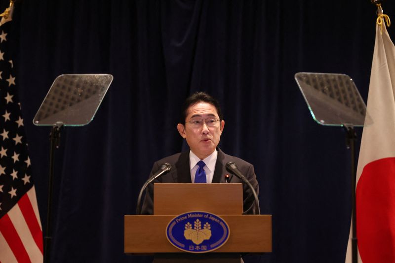 [15日 ロイター] – 岸田文雄首相は14日(現地時間)、訪問先のワシントンで記者会見し、外遊中に会談した主要7カ国(G7)首脳と、対ロ制裁およびウクライナ支援の継続を確認したと述べた。