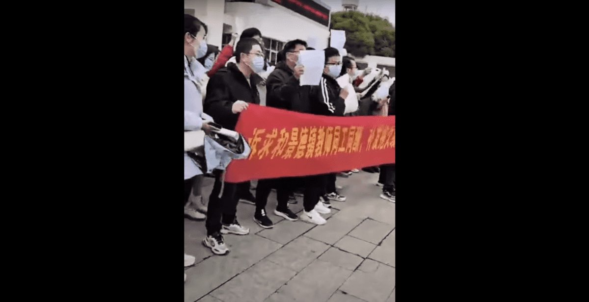 この日、同市の「楽平中学」の校門前に集まった約100人の教師は、「白紙革命」を連想させる白い紙を掲げたり、要求を記した横断幕を掲げるなどして抗議を行った。