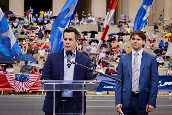 パレード前の集会には、英文エポックタイムズのブランドプロモーション副部長クリス・ボブ(Chris Bob)氏と、英文新唐人テレビ(NTDTV)のワシントンD.C.支局副局長パトリック・デービス(Patrick Davis)氏が招待され、スピーチを行った。二人はいずれも軍人家庭の出身だ。