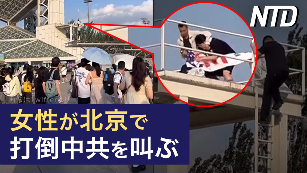 ・北京で女性が米国旗を振り、中共打倒を叫ぶ