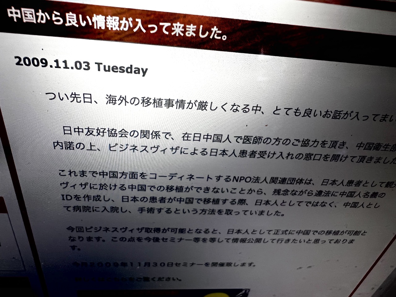 09年、N氏は中国渡航の案内文を発表していた。日中友好協会を通じて、中国の高官との特別な承諾を得たとして、渡航移植のセミナーを開催している。そこには次のように関われている。