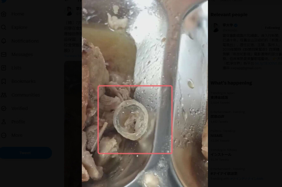 (江西省の職業大学で、学生食堂の料理から出てきた「ネズミの頭によく似た異物」の動画)