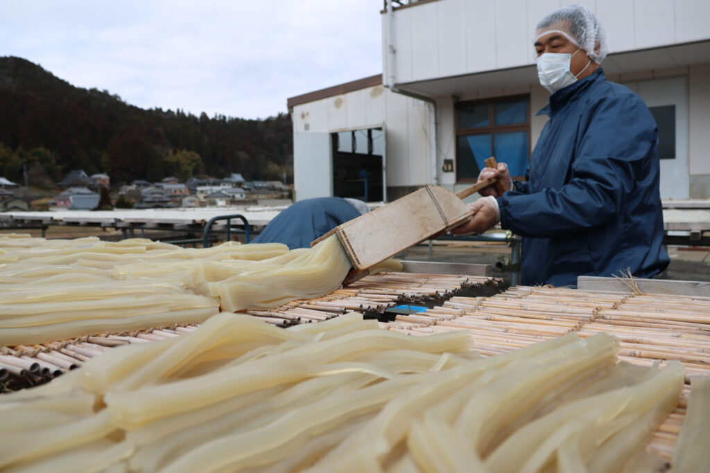 この日行われた作業は、海藻のテングサを煮て作られたところてんを「天筒」という容器に入れてよしずを敷いた台の上に並べる「天突き」。この後、ところてんを夜間の厳しい冷気で凍らせ、日中には天日によって溶け出した水分を蒸発させることを2、3週間繰り返して、寒天にしていきます。