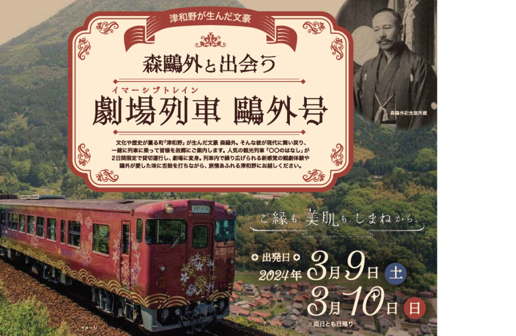 文化や歴史が薫る町「津和野」が生んだ文豪、森鷗外。そんな彼が現代に舞い戻り、一緒に列車に乗って皆様を故郷にご案内します。人気の観光列車「〇〇のはなし」が2日間限定で貸切運行し、劇場に変身。列車内で繰り広げられる新感覚の観劇体験や鷗外が愛した味に舌鼓を打ちながら、旅情あふれる津和野にお越しください。