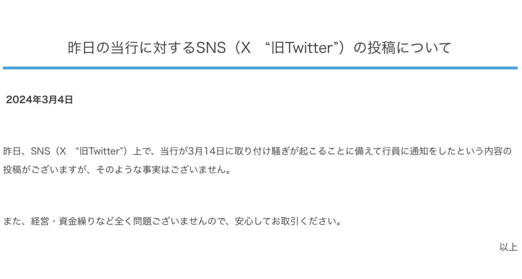 投稿には、福岡銀行が「3月14日に取り付け騒ぎが発生する可能性に備えて、行員に通知した」との内容が含まれていた。銀行側はそのような事実がないとし、公式ホームページで「経営や資金繰りに問題はなく、安心して取引していただける」と強調。「経営・資金繰りなど全く問題ない」と強調した。