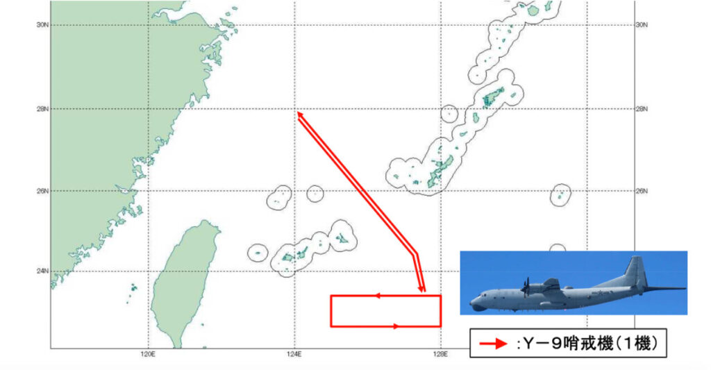 9日と10日の両日午前から午後にかけて、中共のY-9哨戒機1機が東シナ海方面から飛来し、沖縄本島と宮古島との間を通過して太平洋に至り、太平洋上で旋回後、反転し、再び沖縄本島と宮古島との間を通過し、東シナ海に至った。