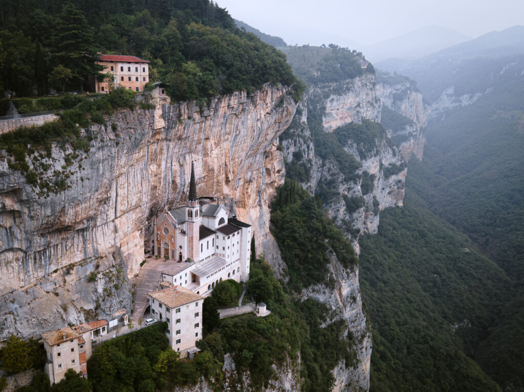 標高2540フィート(約775メートル)からアディジェ川を見下ろすこの聖域は非常に美しく、13世紀には早くもバルド山の聖母に敬意を表するために、数え切れないほどの人々が礼拝堂を訪れていました。崖の上の最初の教会は1480年に建設され、1522年に奇跡とも言われる形で完成したのです。