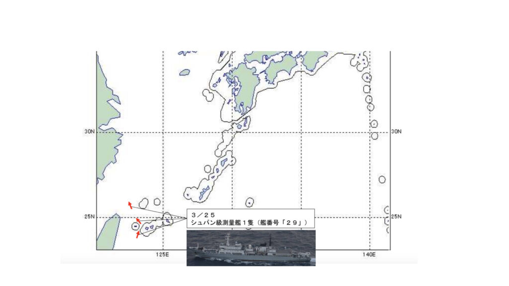 防衛省によると、海上自衛隊は3月25日午前0時頃、同海域を北東進する中共海軍シュパン級測量艦1隻(艦番号「29」)を確認した。 その後、当該艦艇が与那国島と西表島(沖縄県)との間の海域を北東進した後、魚釣島(沖縄県)の西約80キロの海域を北西進したという。