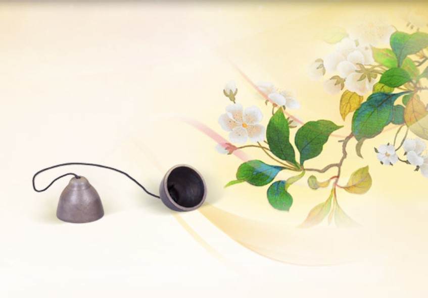 この二つの全く同じ鈴は、 碰鐘、双磬、鈴鈸など、いろいろな名前が付けられています。このハンドベルは、 小さなカップの形で、銅または真鍮の鈴2個からなり、ヒモが付いています。音の高低はありません。鈴と鈴がぶつかると、 余韻の残る明瞭で美しい音を奏でます。