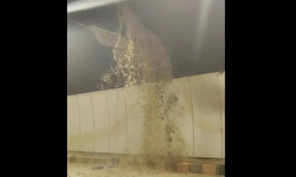 トンネル漏水の様子を捉えた動画がネットに流出しているが、そこには、滝のように泥水がトンネル上部から勢いよく降り注ぎ落ちてくる様子があった。また付近の地面にも水たまりが出来ている。
