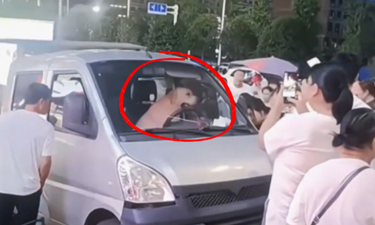 動画のなかには、スマホを手に持つ大勢の野次馬の市民に取り囲まれる車、その車内には運転席にで~んと座り、ハンドルに手をかける「容疑者」のワンちゃんの姿があった。