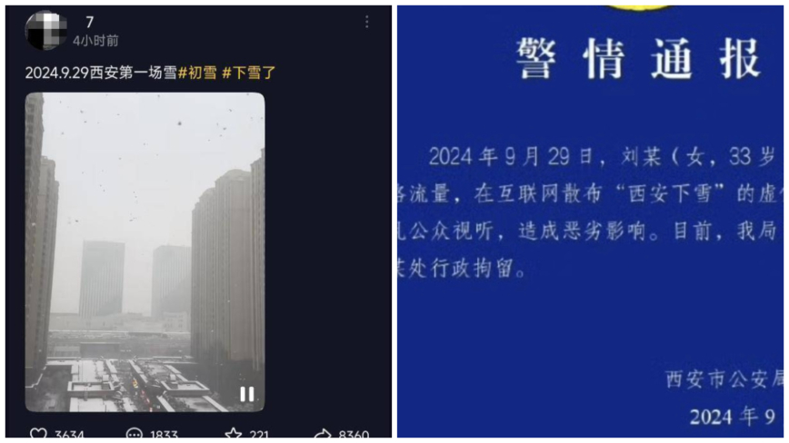 9月29日、「西安(陝西省)で初雪」とする動画をSNSに投稿した女性(劉さん、33歳)が行政拘留されたことがわかった。