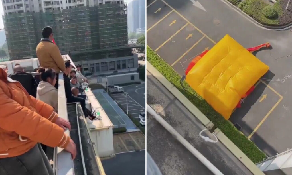 (「給料払わないと自殺するよ」とビルの屋上に集団で登り、抗議する労働者たち。2025年1月4日、広東省肇慶市)