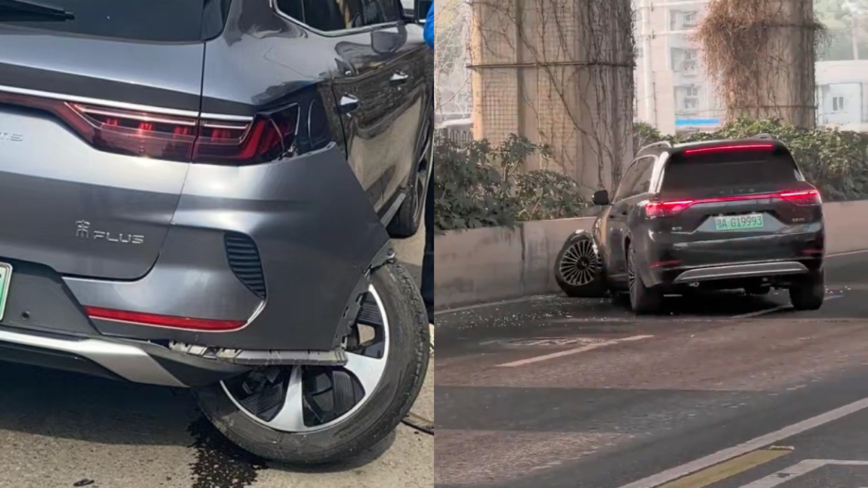 (走行中に車軸が折れた中国産EV。投稿主は2025年3月9日、湖北省武漢市)
