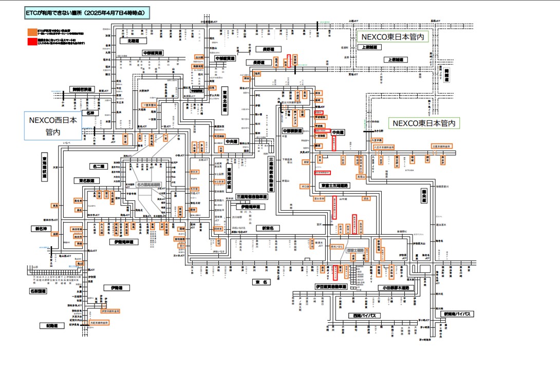 「以下の料金所でETCを制御する設備に障害が発生したことから、ETCの利用ができなくなっています。ETCの障害が発生している料金所においては、そのままご通行ください。通行料金はWEBでのお手続きをお願いいたします。