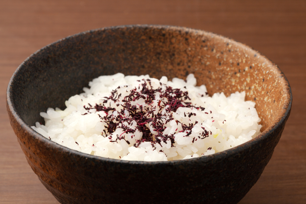 材料:白ごはん 1膳、しそふりかけ 小さじ1、白ごま 少々